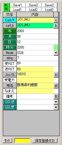 0なし はカウント用、コンテストで交信記録をカウント する場合に利用します. コンテスト点は、ある局と交信したら何ポイントなどと 言うコンテストで利用します 交信は、国内専用か海外も交信するかを指定します オペレーター名は、コンテスト等で利用します |