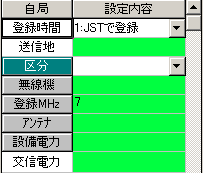 登録時間の入力方法を指定します 送信地は、自局の場所 区分は自由に使用ください 「無線機」「MHz」「アンテナ」自局の設備の登録をします 交信電力は、実際に使用した電力を登録する |